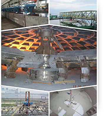 沉淀池刮泥機我公司根據現場的工況要求設計了在扭矩過大時攪拌軸和攪拌耙壁自動提升裝置,當扭矩下降后再自動下降刮泥的功能以防止不穩(wěn)定的工況下攪拌軸和刮泥耙壁的損壞。主要有扭矩和功能電氣控制系統、傳動減速機系統、回轉支撐系統、自動提升系統、攪拌耙壁系統等組成。轉速從0.07-0.2rpm,池體直徑?3-25m,扭矩3000-50000N.m,可以長期無后顧之憂的使用。
